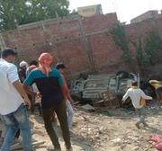 बलिया में तेज दुकान को टक्कर मारते हुए गड्ढे में पलटी कार, कोई घायल नहीं